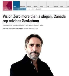 The StarPhoenix report provides a fair account of some of what I said. In the chat with Tank I was also careful to emphasize that the Saskatoon Transportation Committee and its partners are to be commended for their determination to eliminate traffic death and serious injury, and that a data-driven “safe systems” approach is perfectly achievable in any city. I also championed positive developments in other Canadian cities, such as Vancouver’s policy of prioritizing active and mass transit, or the superb #BuildtheVisionTO action items, recently proposed by a consortium of Toronto advocates.