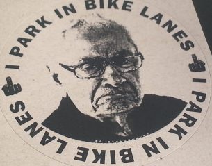 Scroll down for purchase instructions and photos of this pack of nine (9) 2½” round I PARK IN BIKE LANES stickers, printed on high quality Avery stock. For now you can only get them online, shipped direct from the Vision Zero Canada World Headquarters in sunny Autowa. But if you can convince a store—maybe a bike store or coffee shop near you—to carry them, they’ll receive 10 resellable sticker multipacks or 100 individual stickers for every $50 they send … PLUS YOU will receive 50 individual stickers for FREE in the same order.