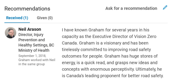 * Here’s a kind and unsolicited recommendation on my LinkedIn page, from the man who wrote the book on road safety in Canada: