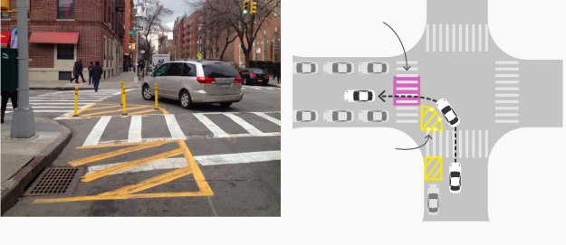 The Complete Hardened Centerline (jokingly dubbed “the Deluxe treatment”) combines the basic hardened centerline and slow turn wedge. Source: Karen Hao & Amanda Shendruk, “One small change to New York’s intersections is saving pedestrians’ lives”, Quartz, 21 Sept 2018.